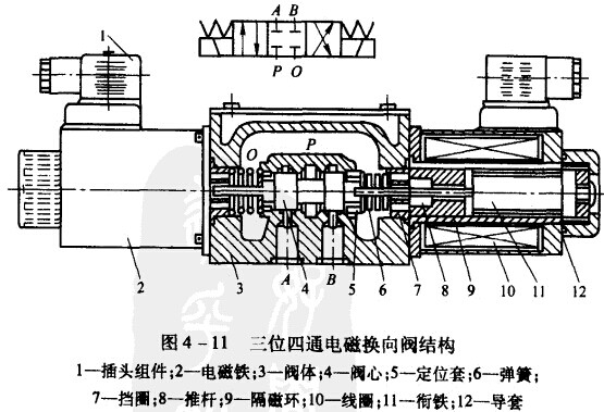 圖4-12所示為二位四通電磁閥的符號(hào),圖4-12(8)為單電磁鐵彈簧復(fù)位式.圖4-12(b)為雙電磁鐵銅球定位式。二位電磁閥.一般都是單電磁鐵控制的,但無復(fù)位彈簧雙電磁鐵二位閥,由于電磁鐵斷電后仍能保留通電時(shí)的狀態(tài),從而減少了電磁鐵的通電時(shí)閥,延長了電磁鐵的壽命,節(jié)約了能源;此外,當(dāng)電磁鐵因故中斷時(shí),電磁閥的工作狀態(tài)仍能保留下來,可以避免系統(tǒng)失靈或出現(xiàn)事故。