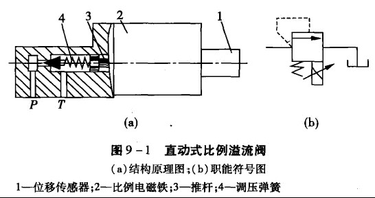 電液比例溢流閥。用比例電磁鐵取代直動式溢流闊的手調裝置,便構成直動式比例溢流閥,如固9 -1所示。圖( a)為結構原理,圖(b)為職能符號。比例電磁鐵2的推桿3對調壓彈簧4施加推力,隨著輸入電信號強度的變化,便可改變調壓彈簧的壓縮量,該閥就能按比例遠程控制其輸出油液的壓力或實現(xiàn)多級調壓。把直動式比例溢流閥作先導閥與普通壓力閥的主閥相配,便可組成先導式比例溢流閥、比例順序閥和比例減壓閥。