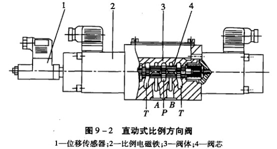 在圖9 -1和圖9 -2中,比例電磁鐵的前端都附有位移傳感器(或稱差動變壓器),這種電磁鐵稱為行程控制比例電磁鐵。位移傳感器能準確地測定比例電磁鐵的行程,并向電放大器發(fā)出電反饋信號。電放大器將輸入信號和反饋信號加以比較后,再向電磁鐵發(fā)出糾正信號以補償誤差。這樣便能消除液動力等干擾因素,保持準確的闊心位置或節(jié)流口面積。