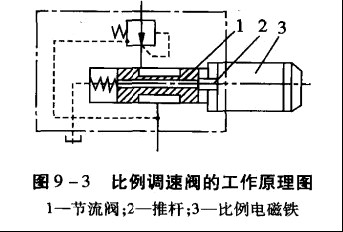 (3)四柱油壓機電液比例調速閥。用比例電磁鐵取代節(jié)流閥或調速閥的手調裝置,以輸入電信號控制 節(jié)流口開度,便可連續(xù)地或按比例地遠程控制其輸出流量。圖9 -3為比例調速閥的工作原理圖。圖中的節(jié)流閥芯由比例電磁鐵2的推桿操縱,故節(jié)流口開度便由輸人電信號的強度決定。由于定差減壓閥已保證了節(jié)流口前后壓差為定值,所以一定的輸入電流就對應一定的輸出流量。